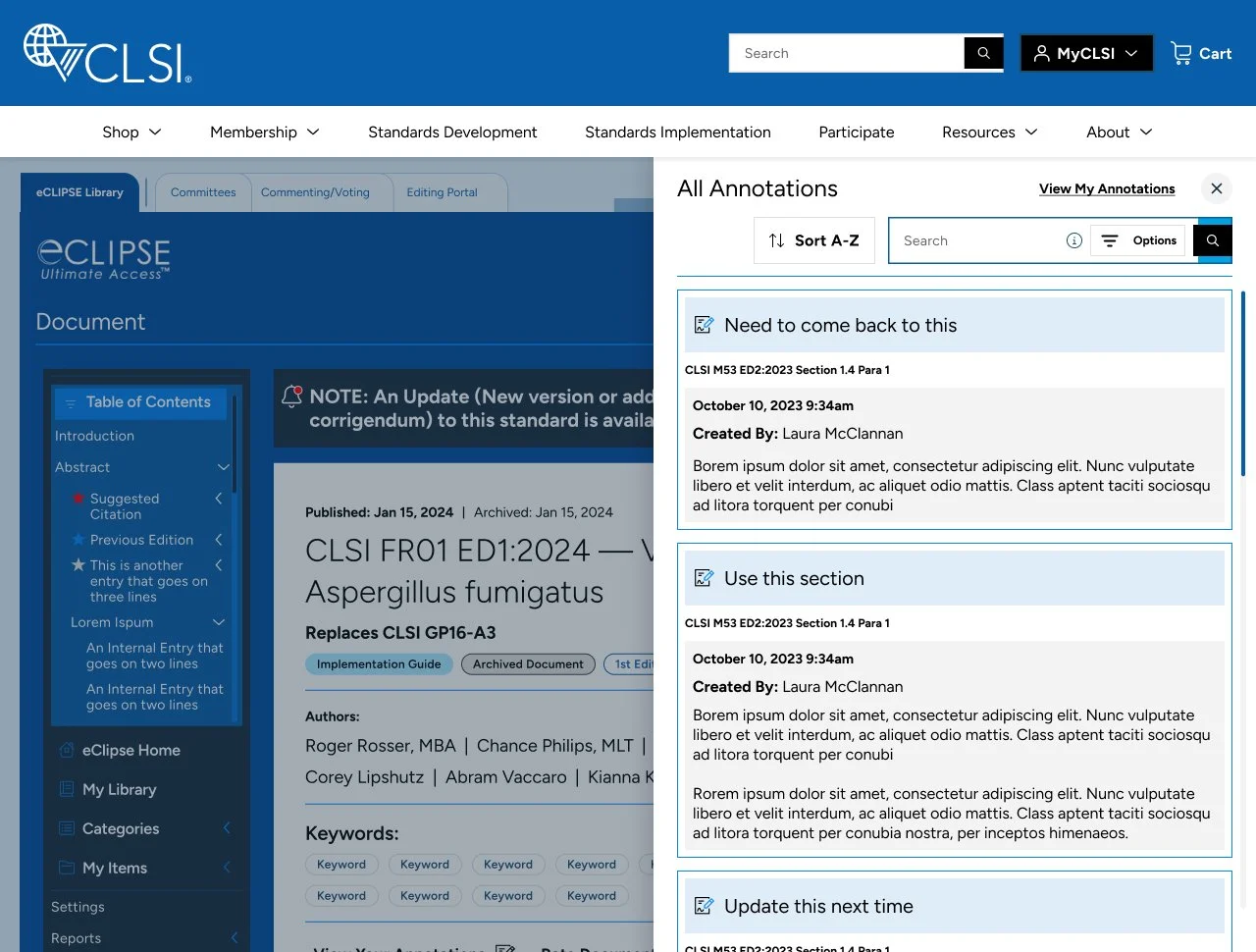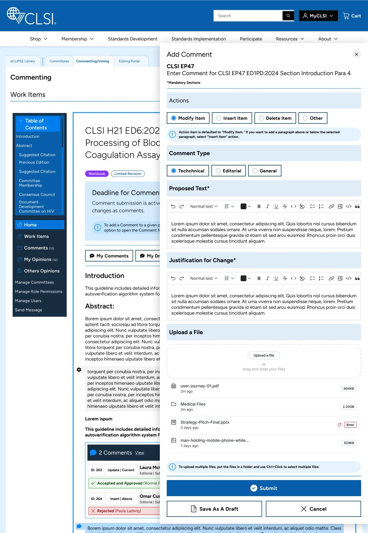 For CLSI, our work extended far beyond the public-facing rebrand — we also overhauled their legacy backend platform, a system used daily by thousands of scientific professionals around the world. This included rebuilding and redesigning five critical tools: myCLSI, eClipse, Commenting, Committees, and Editing. These platforms are the backbone of how global experts read, edit, and convene on the laboratory standards that drive consistent, safe science everywhere.